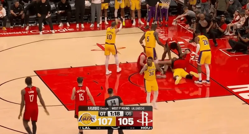 斯玛特控制住地板球后迅速反应立即“沾手即传”甩给完成抢断后奔向前场准备发动反击的詹姆斯,詹姆斯三分线外面对申京的扑防将球拨给身处空位的肯纳德,随后再接肯纳德回传,面对前来扑防的申京、贾巴里两人,一记虚晃后持球后仰三分手起刀落完成关键绝平。