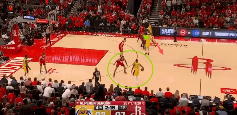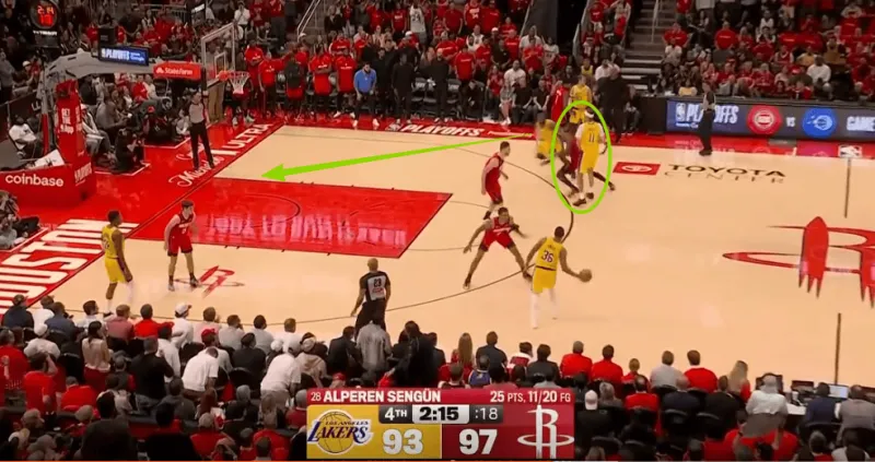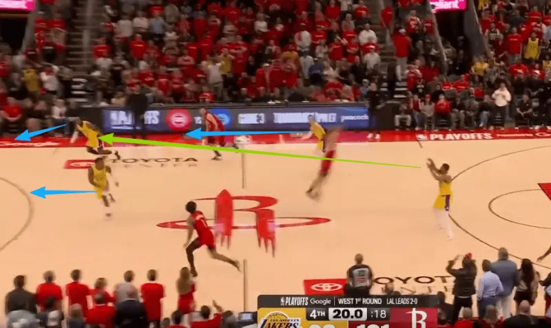 斯玛特推进过半场后落位强侧45°持球发牌,弱侧的詹姆斯随即抓“早期进攻阶段”发动传切战术配合:詹姆斯先是佯装借助海斯无球掩护兜至弧顶(执行“Wide Action”战术)误导追防的伊森,在伊森准备挤过掩护墙的瞬间,老詹立即反跑空切篮下摆脱伊森长驱直入如入无人之境(这里的细节是:海斯“Trailer”过半场后留在弧顶准备设置掩护将禁区拉空+八村沉至弱侧底角使得谢泼德成为弱侧的LowMan。),