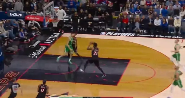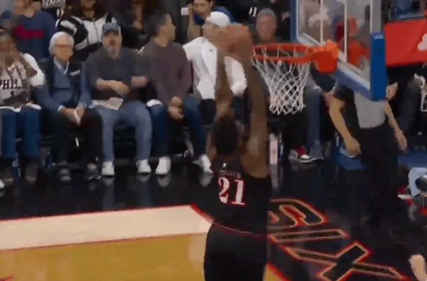 恩比德反击双手暴扣得手,命中今年季后赛的首个进球