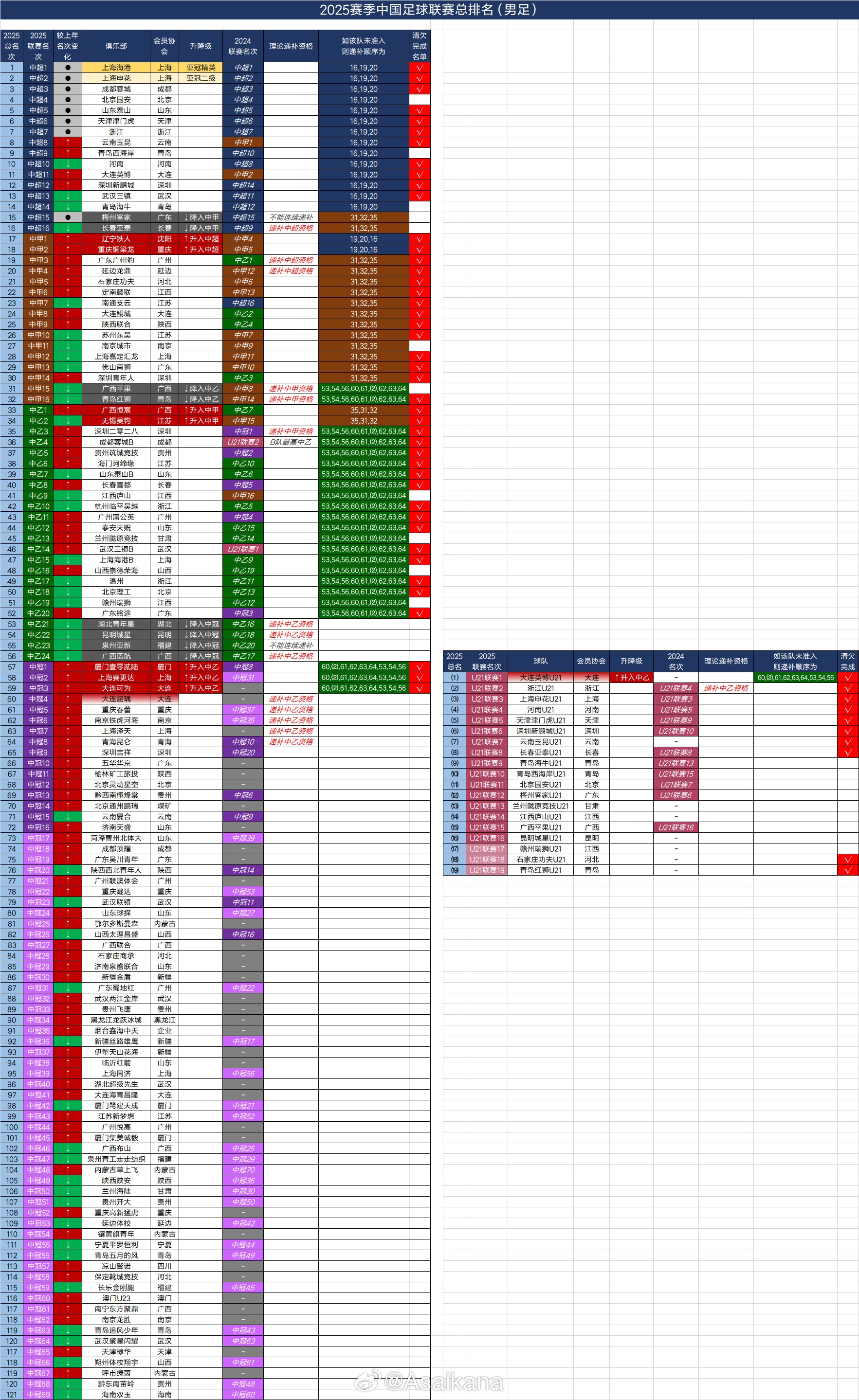 2025赛季中国足球四级联赛总排名(2025.12.20)